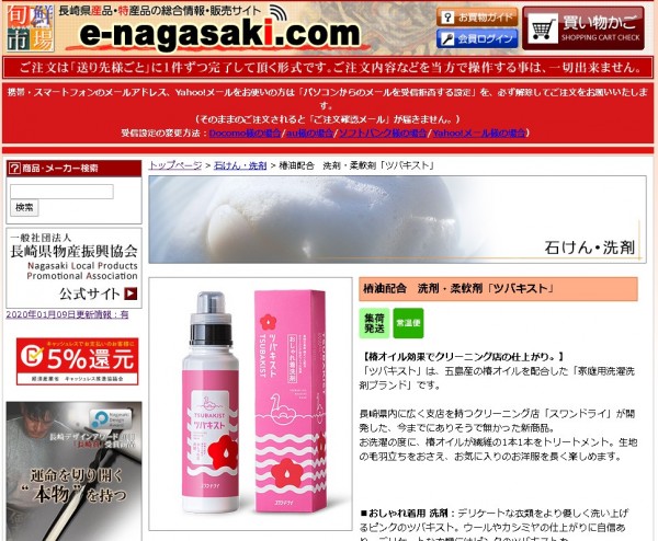 社団法人長崎県物産振興協会が運営する「長崎県物産・特産品の総合情報・販売サイト」にて、五島列島産ツバキ油配合洗剤・柔軟剤「ツバキスト」及び「五島椿油」の取扱いを開始しましたので、お知らせいたします。